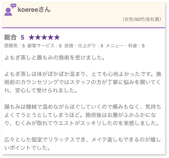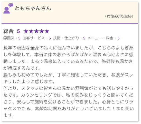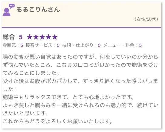 実際に働いてみて、よもぎ蒸しや腸もみなど、内側からのケアをすることでお客様からも便秘や生理痛の改善だけでなく身体が楽になってきた、疲れが取れやすくなったとお声をいただき、私自身も嬉しくなりました。