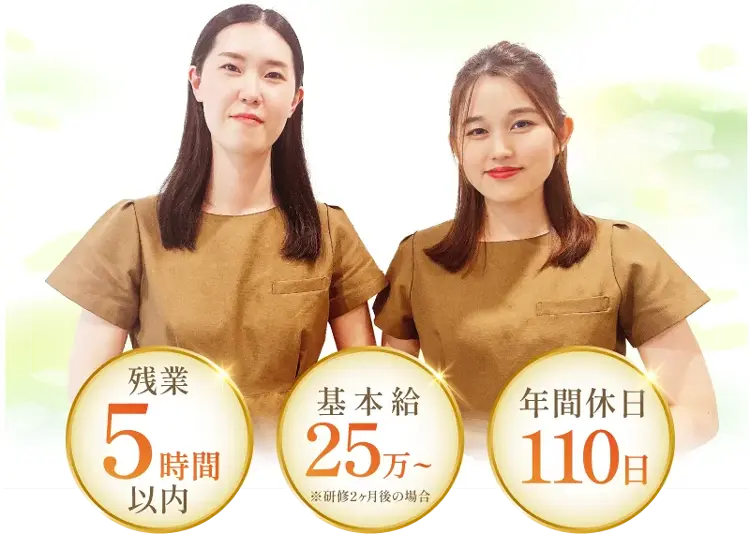 | 試用 期間 | 試用期間6ヶ月 試用期間6ヶ月のうち、最初の2ヶ月は研修期間 期間中は月給24万円 まずは簡単な施術から覚えてデビューしていただきます。 2ヶ月間で手技取得→メニューデビューを繰り返し、全てのデビューがクリア出来た時点で月給25万円に! |